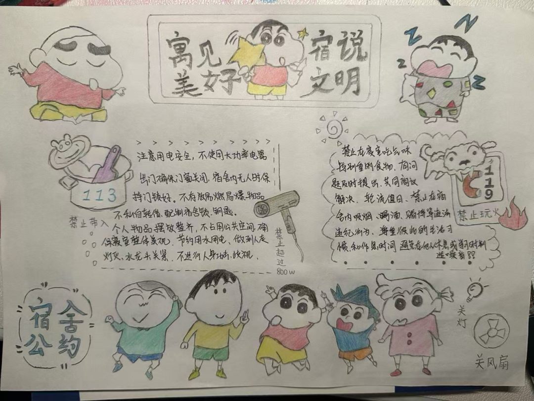 此次寝室公约设计大赛的成功举办,不仅提升了宿舍的文明程度,也让同学们在合作中增进了友谊,同时有助于推进学院素质文明建设工作,为营造更加和谐的校园氛围贡献力量。学院将以此次活动为契机,举办更多类似的活动,为同学们提供更加丰富多彩的校园文化生活。同时,也希望广大同学能够积极参与到宿舍文化建设中来,共同为构建和谐、美好的宿舍环境贡献自己的力量。