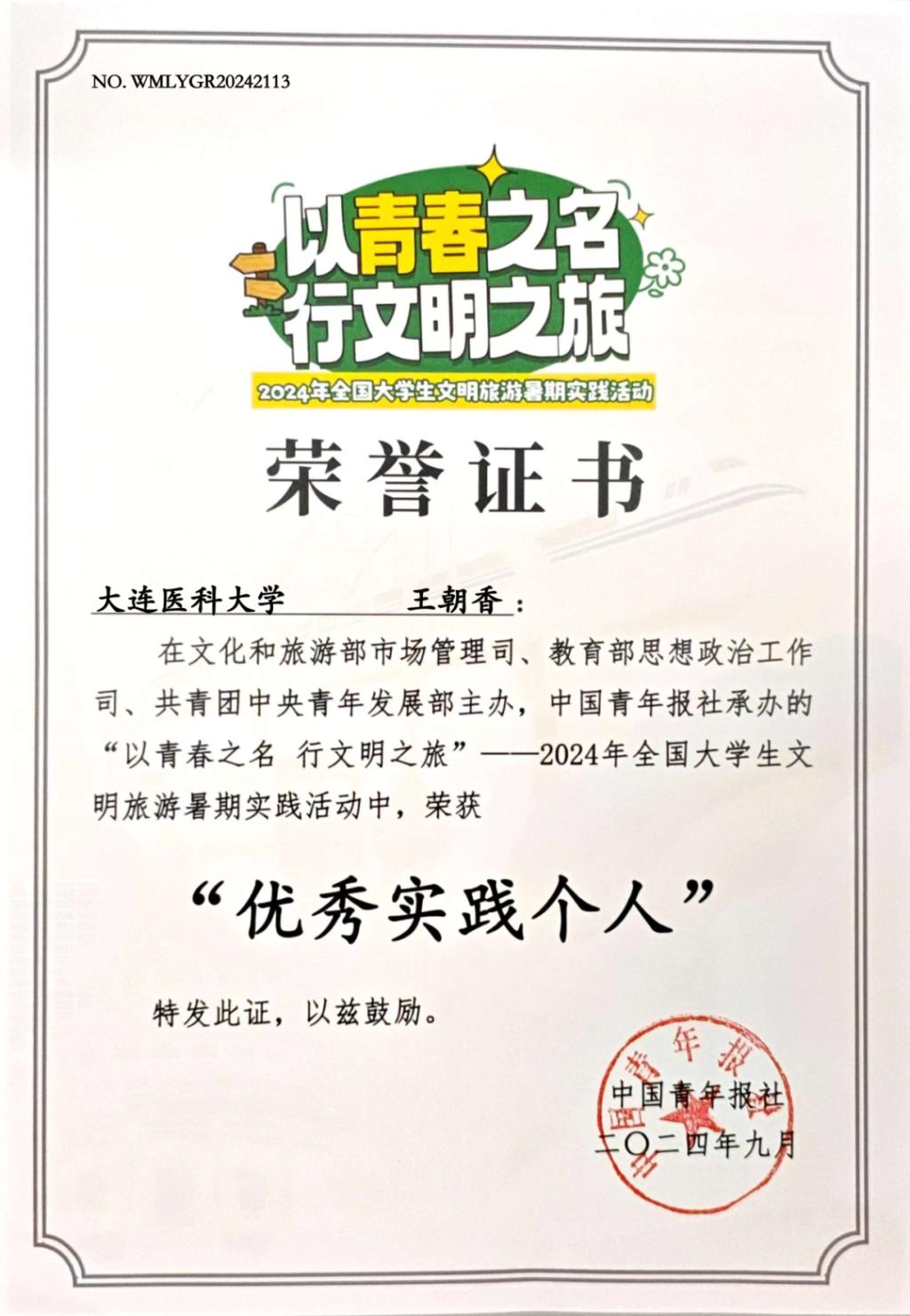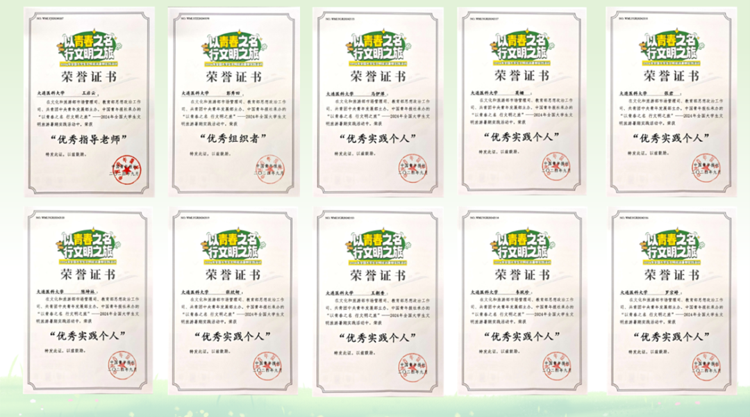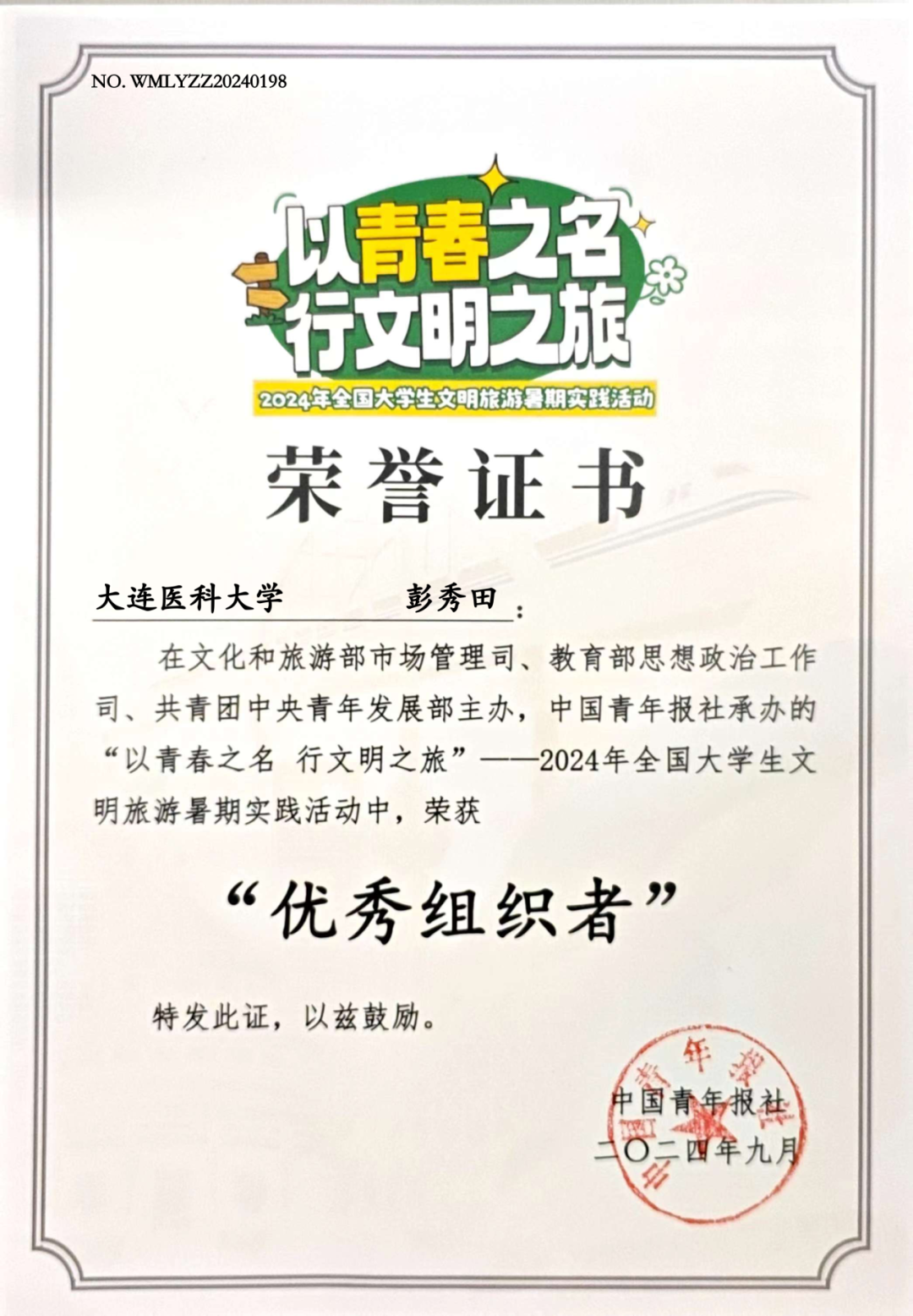 此外,公共卫生学预防医学专业2023级本科生彭秀田在本次“以青春之名 行文明之旅”——2024年全国大学生文明旅游暑期实践活动中荣获“优秀组织者”称号。她在实践活动中,充分发挥组织协调能力,确保实践活动顺利进行。同时德赢ac米兰官方合作预防医学专业2022级本科生马伊萍、莫姗、陈坤林,预防医学专业2023级本科生罗宗婷、王朝香,公共事业管理专业2022级本科生张欣妍、公共事业管理专业2023级本科生韦跃珍以及药学院药学专业2022级本科生张君多名同学荣获“优秀实践个人”荣誉称号。他们在实践活动中,积极参与,无私奉献,展现了德赢winac米兰青年学子的良好风貌。