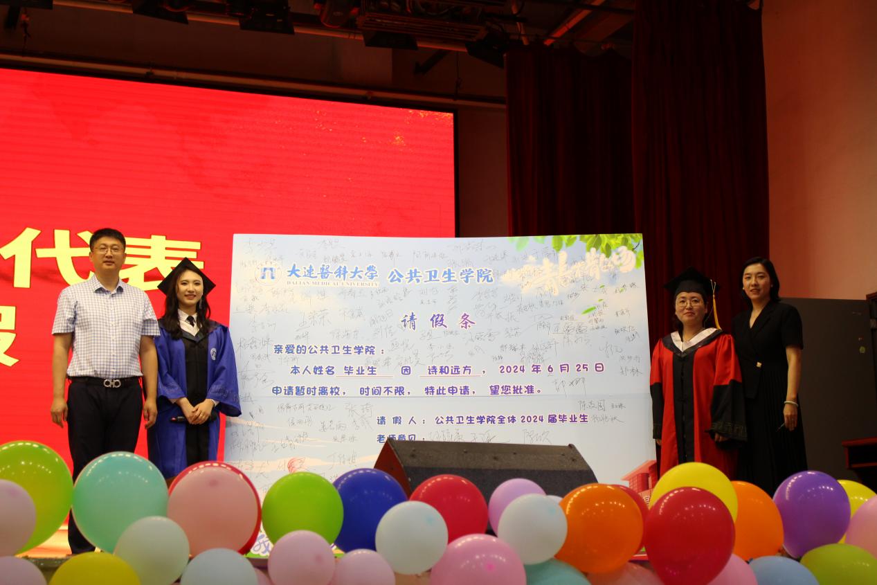 随着典礼进入尾声,研究生李小涵代表2024届全体毕业生向学院提交最后一次请假单,并表达了对学院深深的祝福,于泳、孙鲜策、陈欣上台完成了毕业生的最后一次请假审批,伴随着《祝你一路顺风》歌声的响起,学院毕业典礼圆满结束。