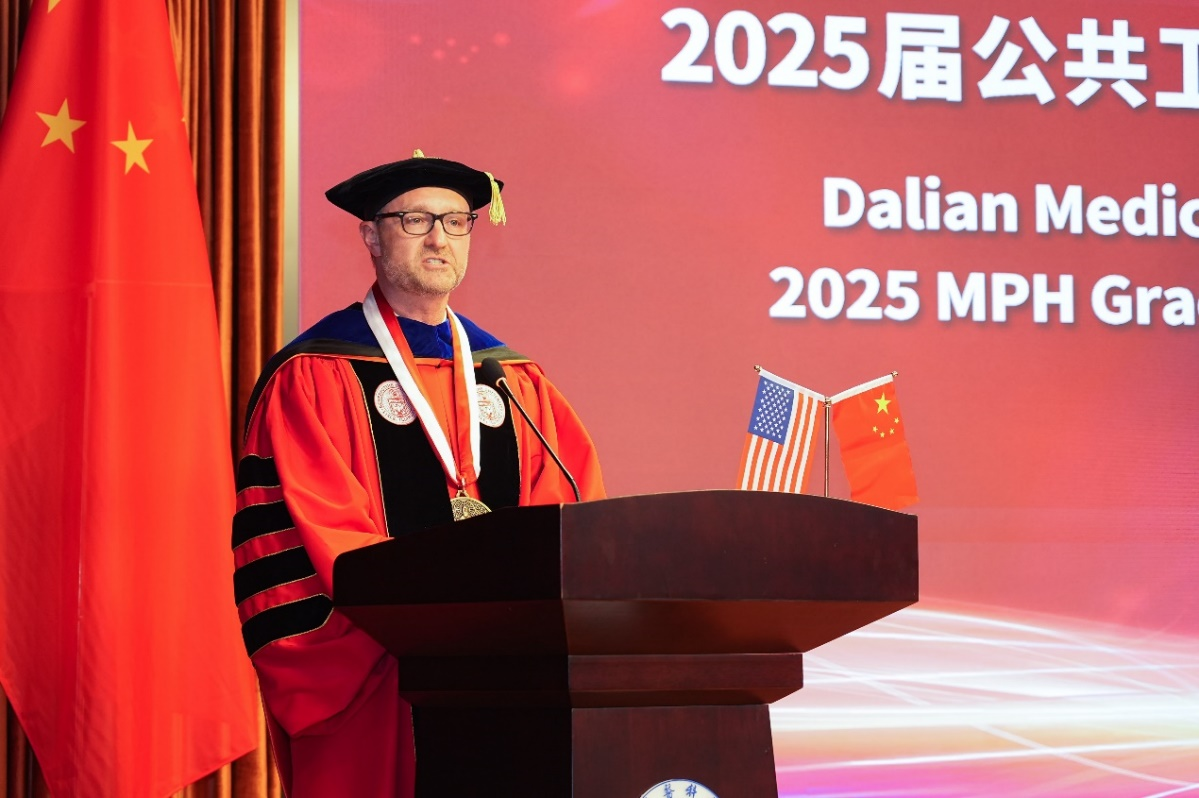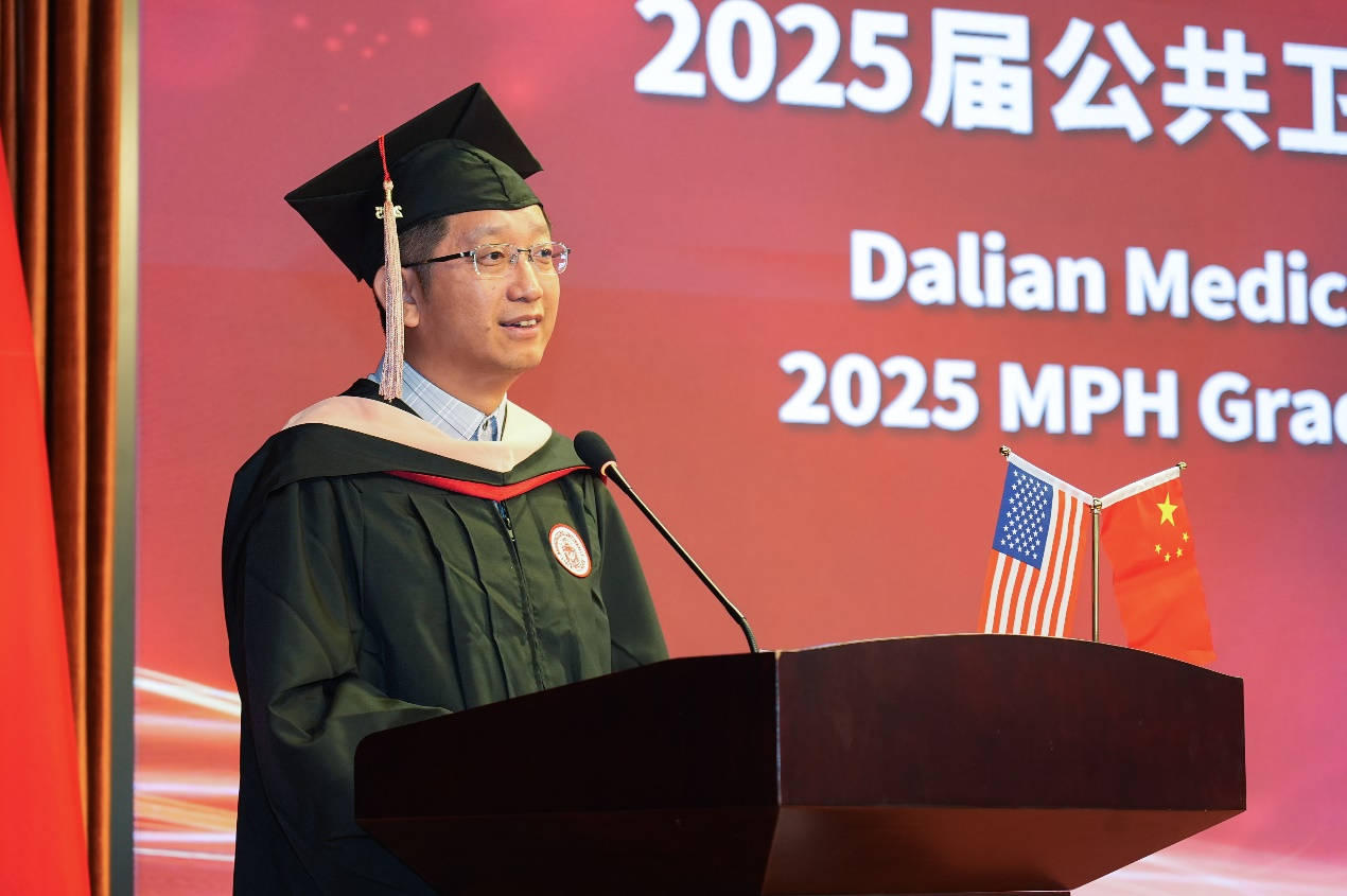 优秀校友代表、大连市第七人民医院老年病房主任姚烨发言。他向毕业生致以祝贺,并回顾了在MPH项目课程学习与学术讨论的收获,强调公卫人需牢记使命、投身实践。他结合工作经验提出三点建议:保持学习、注重合作、敢于探索。他寄语毕业生将毕业视为新起点,牢记公卫人的使命责任,在各自领域拼搏奋斗。最后,他祝福德赢winac米兰与美国班尼迪克大学发展蒸蒸日上,师生皆展美好前程。