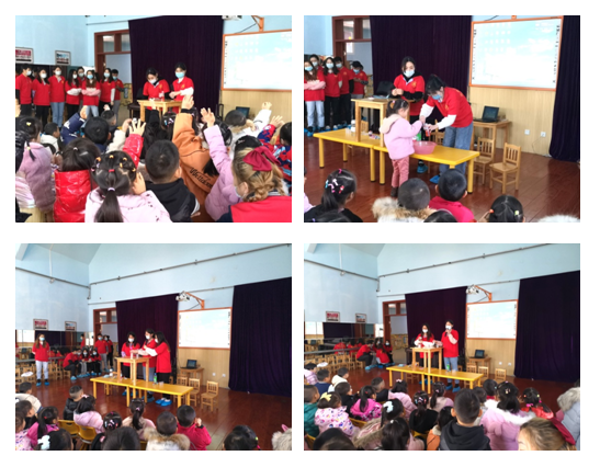 支部成员孟子璇和杜佳荷为小朋友们演示了喷泉实验、变色实验和扩散实验,王馨慧、李铮、李佳欣则为小朋友们展示了利用化学反应吹气球的实验,小朋友们在享受实验乐趣的同时轻松地掌握了科学知识,晦涩的知识在实验中变得易于理解,培养孩子们动手能力的同时也使他们增加了对科学的兴趣。
