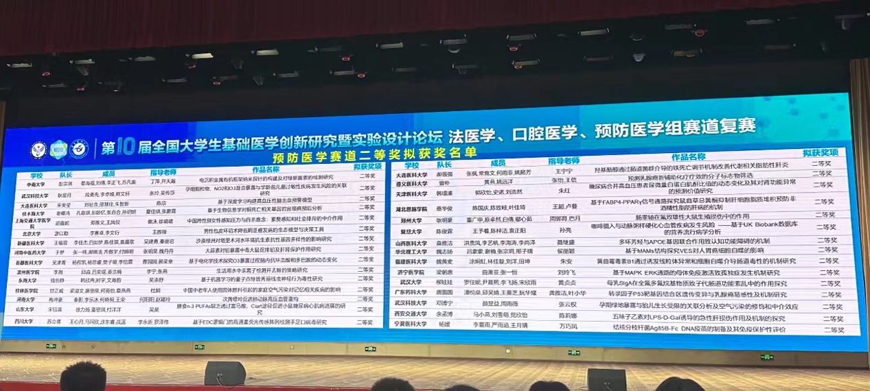 2024 年 7 月 20 日,在遵义医科大学召开的“第10届全国大学生基础医学创新研究暨实验设计论坛”本科院校组复赛中,德赢官网师生取得了令人振奋的成绩。由陈欣副院长和王宁宁老师分别指导的学生团队,在预防医学赛道中均荣获二等奖。这是德赢官网教师在此项全国性赛事中的重大突破,标志着德赢官网师生在基础医学领域的创新研究和实验设计方面又迈上了新的台阶。