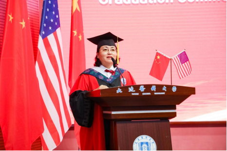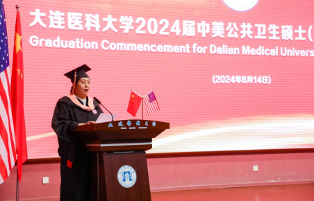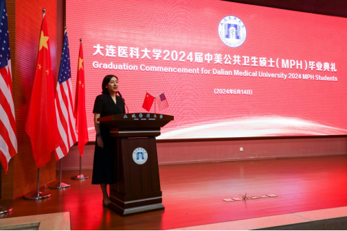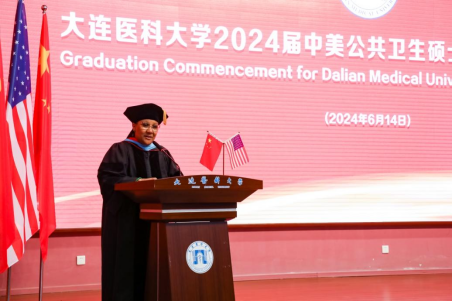 美国班尼迪克大学首席多样化官Julie Dockery博士在讲话中深情寄语毕业生。她希望毕业生们通过中美MPH项目的学习,深刻理解公共卫生与人类和社会健康的紧密联系,同时成为公共卫生变革的使者,中美文化交流的桥梁,推动健康社会进步的催化剂。她鼓励毕业生们凭借所掌握的公共卫生知识和技能,积极应对全球健康挑战。凭借独特的国际视角,努力建设一个更加包容和可持续的世界。