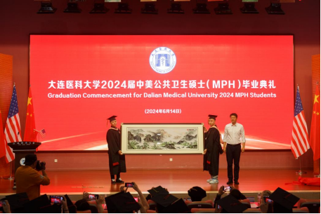 2024届毕业生、大连市友谊医院护理部主任李波代表全体毕业生发言。她表示,衷心感谢学校提供学习和逐梦的平台,国际化的授课模式和全英文沉浸式的教学,让学生们接收到了高质量的教育资源。感谢中美双方教师的辛勤付出,在中美合作MPH项目学习期间,同学们不仅学到了理论知识,而且提升了应用与实践的能力。今后,大家将利用所学成果在各自岗位上努力工作,以更高的使命感和责任感要求自己,为公共卫生和医疗卫生事业的发展贡献力量。之后,毕业生们将一幅“紫气祥云”的匾画赠送给母校,留作纪念,于泳书记代表学校接收纪念品。