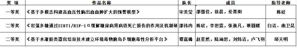 此次复赛前,学院组织校内外专家为三支参赛队伍精心打磨作品,做了充分准备。经过激烈角逐,最终德赢官网三支参赛队伍在预防医学赛道复赛中取得了参赛历史以来的最好成绩,获得一等奖1项、二等奖2项。由陈欣副院长指导的22级公共事业管理专业宋美莹团队申报的作品《基于多模态构建高血压性脑出血血肿扩大的预警模型》荣获预防医学赛道复赛一等奖,由白洁老师指导的21级预防医学专业邵祎冉团队申报的作品《岩藻多糖通过SIRT1/HIF-1α缓解糖尿病肾病铁死亡损伤的作用及机制研究》获得了预防医学赛道复赛二等奖,由邱天明老师指导的21级预防医学专业谭嘉璐团队申报的作品《基于水凝胶类器官培育技术建立环境毒物胰岛β细胞毒性分析平台》获得了预防医学赛道复赛二等奖。这一系列成绩的取得,彰显了德赢官网师生在预防医学领域的实验设计水平与创新能力,标志着学院教育教学与科研能力的进一步提升。接下来,德赢官网将继续打磨参赛作品,力争在即将于8月举行的全国总决赛中取得更好的成绩。